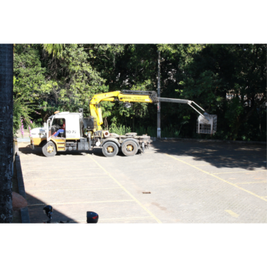 A manutenção contou com o auxílio de um guindaste para alcançar as regiões mais altas e aparar os galhos das árvores.