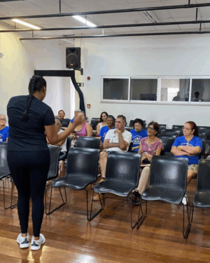 A ação beneficiou aproximadamente 13 idosos atendidos pela instituição, com o objetivo de promover uma manhã de informação, movimento e socialização. A programação incluiu uma breve palestra, atividades de alongamento e momentos de dança, estimulando a interação entre os participantes e proporcionando um ambiente de bem-estar físico e cuidado emocional.