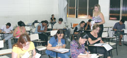 Encerrou-se, no dia 5 de novembro, o curso de extensão universitária em Libras – Língua Brasileira de Sinais, com carga horária de 40 horas, oferecido pelo Centro Universitário de Formiga. As aulas tiveram início em maio deste ano e foram ministradas pela intérprete Profa. Débora Bessas. Na foto, os estudantes durante prova de conhecimentos.