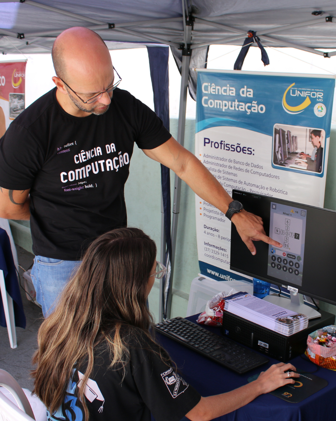 Além disso, os cursos do UNIFOR-MG levaram atividades interativas e demonstrações práticas, que ajudaram os estudantes a conhecer o que se aprende em cada área. O curso de Educação Física, por exemplo, promoveu uma oficina de jump e realizou avaliação corporal. A equipe de Psicologia realizou dinâmicas sobre autoconhecimento, Ciência da Computação levou jogos interativos sobre o uso da inteligência artificial, Biomedicina realizou tipagem sanguínea, Direito fez dinâmicas de perguntas e respostas sobre a Legislação, Fisioterapia conduziu um experimento científico com os estudantes, além de diversas outras atividades dos demais cursos.