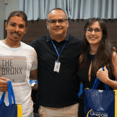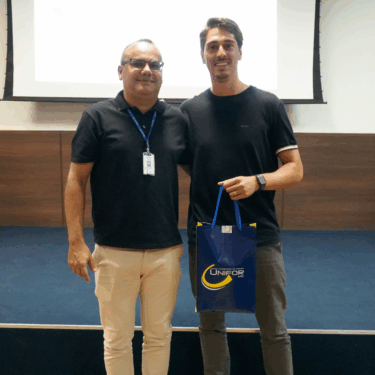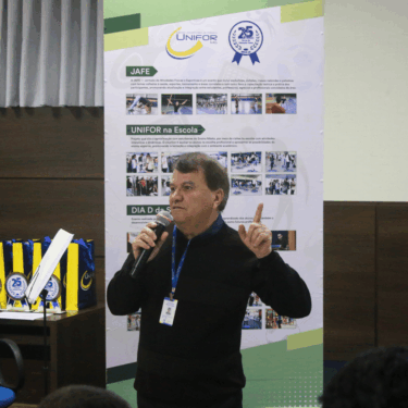 Em seguida, o egresso do curso Elias Wallace Amaral de Oliveira relatou sua trajetória no Curso. Ele destacou os desafios enfrentados até se consolidar na carreira e a importância da formação acadêmica em sua vida. “Eu iniciei aqui em 2017, vindo e voltando para Cláudio todos os dias, quatro horas de viagem, foi um desafio enorme, mas não desanimei porque o UNIFOR-MG me proporcionou diversos momentos, abriu um leque imenso de áreas que a gente pode trabalhar com a Educação Física e o curso me tornou uma pessoa muito diferente”, disse. Ele ainda incentivou os estudantes presentes a acreditarem no potencial da profissão: “A Educação Física é uma grande profissão, que você pode transformar vidas através dela.”