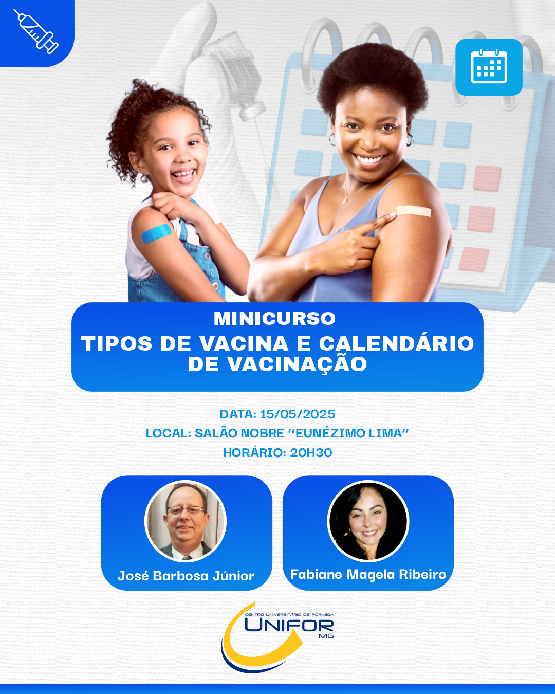 No mesmo dia, a partir das 20h30, os alunos terão um “Minicurso com os Tipos de Vacina e Calendário de Vacinação”, no Salão Nobre “Eunézimo Lima”, conduzido pelo convidado José Barbosa Júnior e pela enfermeira Fabiane Magela Ribeiro.