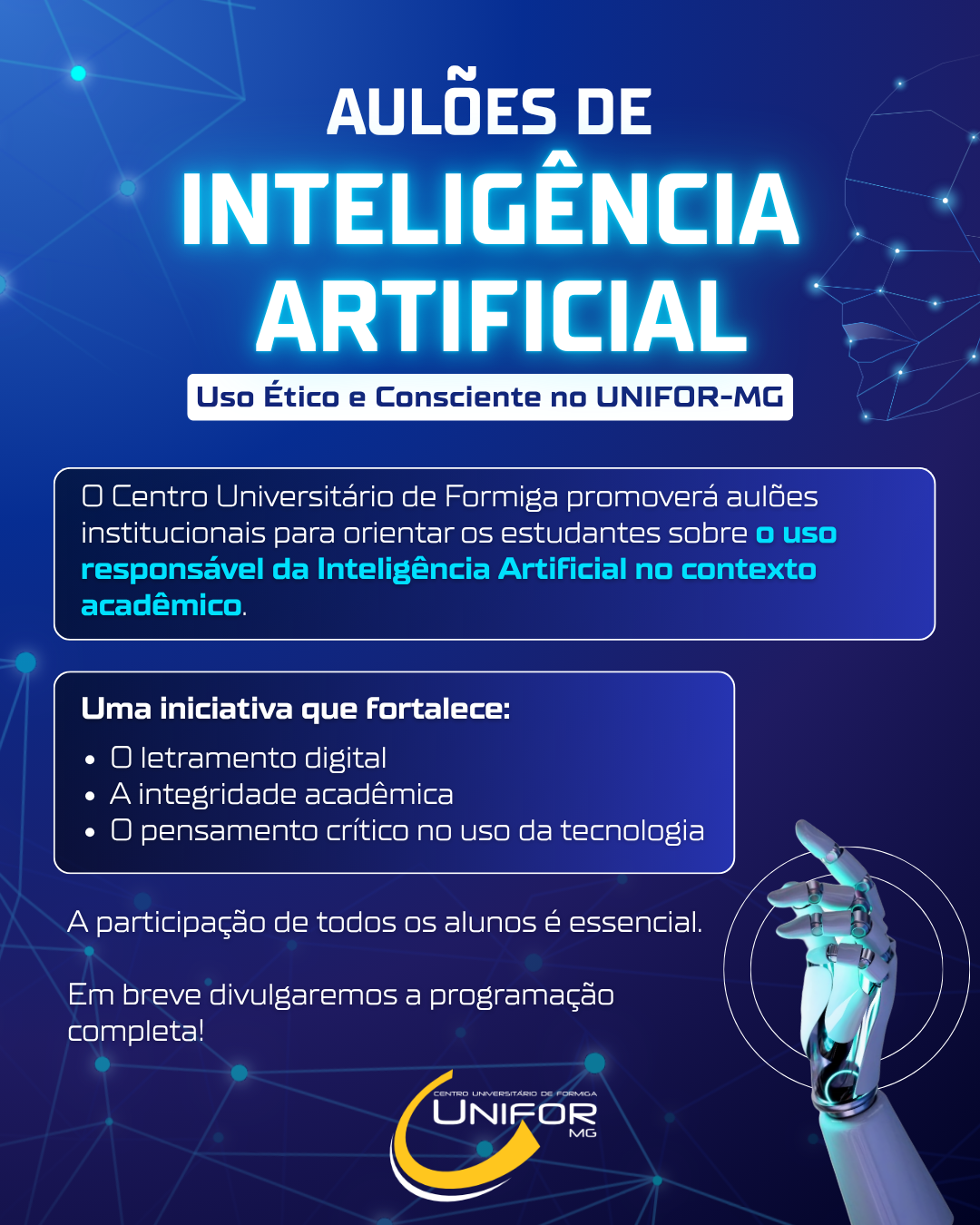 O UNIFOR-MG anunciou a realização de aulões voltados ao tema da Inteligência Artificial, com foco no uso responsável e consciente da tecnologia no contexto acadêmico. A iniciativa busca preparar os estudantes para lidar com ferramentas cada vez mais presentes no dia a dia educacional, incentivando não apenas o domínio técnico, mas também a reflexão ética sobre seu uso.