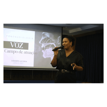 Mediadas pela Profa. Gisela Campos Mendonça, as conferencistas trouxeram temas atuais e pertinentes à saúde vocal para os discentes. Dâmaris Lacerda, fonoaudióloga pós-graduada em Comunicação e Oratória, alertou sobre a importância de tratar a voz antes que apareçam complicações e como o acolhimento oferecido pelo profissional faz diferença para o paciente.