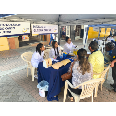 A visitante Marinez é aposentada e passou pela medição de glicose, medição de pressão e teste de inteligência. Ela comentou que o UNIFOR na Praça é importante para atender à população, tanto com os serviços de saúde quanto com conhecimento, reforçando a relevância da educação.
