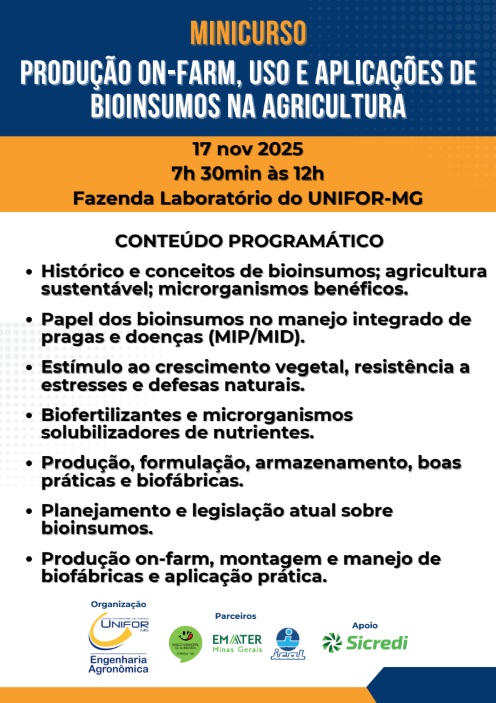 O curso de Engenharia Agronômica do UNIFOR-MG promoverá o Minicurso “Produção On-Farm, Uso e Aplicações de Bioinsumos na Agricultura Familiar”, que acontecerá no dia 17 de novembro de 2025, das 7h30 às 12h, na Fazenda Laboratório do UNIFOR-MG. A atividade é voltada a produtores rurais, estudantes e profissionais do setor agrícola, com o objetivo de disseminar conhecimentos sobre a produção e o uso sustentável de bioinsumos.