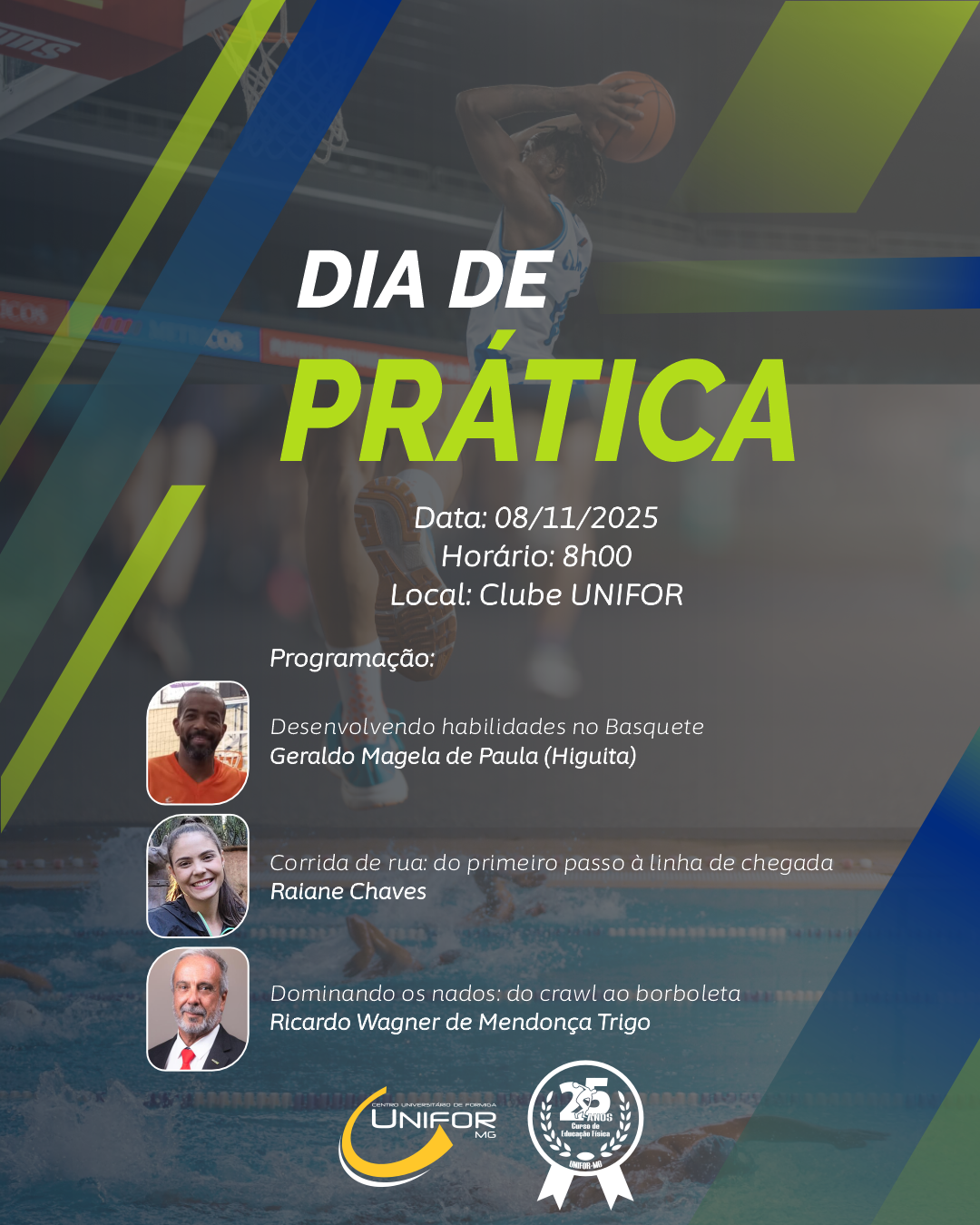 O Dia de Prática, evento voltado à vivência esportiva e ao aprimoramento de habilidades em diferentes modalidades, será realizado no dia 8 de novembro, a partir das 8h, no Clube UNIFOR. A programação reunirá profissionais renomados que irão conduzir atividades dinâmicas e educativas ao longo da manhã.