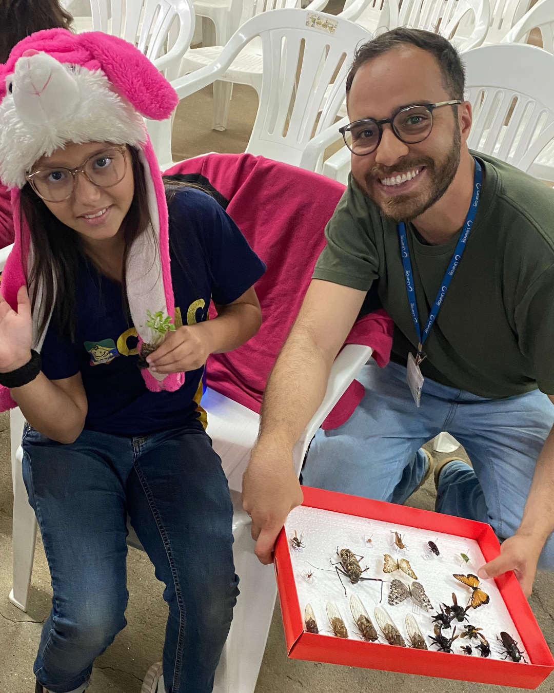 Ao longo da apresentação, as crianças tiveram a oportunidade de conhecer, de forma lúdica e interativa, conceitos fundamentais de ecologia. Um dos destaques foi a exibição de uma coleção entomológica composta por borboletas, abelhas, besouros e gafanhotos. A atividade despertou a curiosidade dos estudantes ao permitir a observação direta desses insetos e evidenciar a importância que eles desempenham na polinização, na ciclagem de nutrientes e na manutenção do equilíbrio dos ecossistemas.